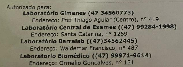 Em setembro deste ano, o Barravas Online recebeu outra denúncia sobre o caso. Ao ser questionada, a Secretaria de Saúde de Barra Velha informou: “A Secretaria da Saúde da Prefeitura de Barra Velha informa que possui 4 laboratórios credenciados, com cota mensal de vinte mil para cada laboratório, totalizando 80 mil por mês em exames. Dos 4 laboratórios credenciados, 2 estão realizando agendamento no prazo de até 20 dias, outro realiza atendimento sem necessitar de agendamento, enquanto um está com a agenda lotada por ter tido mais procura pelos pacientes. Na guia do exame, possui o endereço e contato dos 4 laboratórios credenciados, sendo possível o paciente entrar em contato para se organizar em relação a coleta do exame. Em caso de dificuldade de agendamento o paciente pode entrar em contato com a secretaria de saúde. A Secretaria também informa que está se organizando para aumentar a cota de exames mensais de cada laboratório credenciado”. Os pacientes que precisam de exames médicos pelo SUS podem fazer a solicitação em um dos seguintes laboratórios: