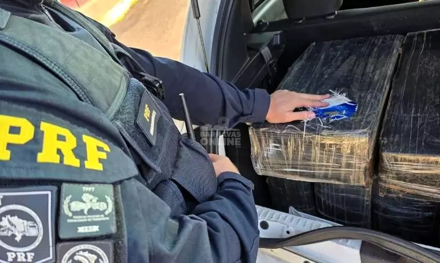 A equipe policial realizava uma fiscalização de rotina quando deu ordem de parada ao automóvel. Durante a inspeção, os agentes notaram um volume suspeito sob uma lona escura, que preenchia todo o banco traseiro e o compartimento de bagagem.