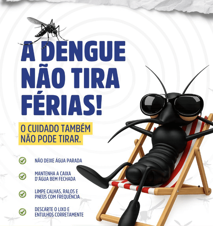 A dengue não tira férias — e o cuidado também não pode tirar. Mesmo no período de descanso, é fundamental manter a atenção dentro e fora de casa. Pequenas atitudes fazem toda a diferença no combate ao mosquito Aedes aegypti e na proteção da sua família e da nossa cidade.